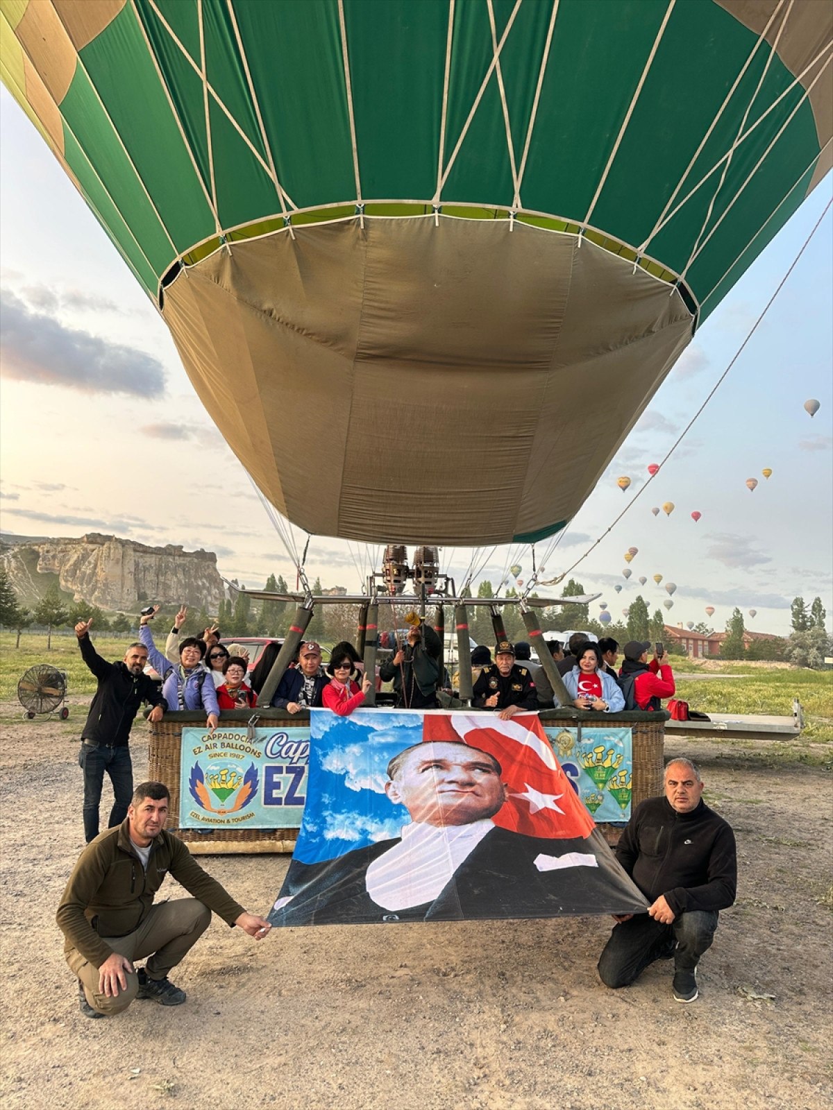 Nevşehir’in Göreme beldesindeki kalkış alanında takımlarca uçuş için hazırlanan sıcak hava balonlarının sepetlerine Türk bayrakları ve Atatürk posterleri asıldı.