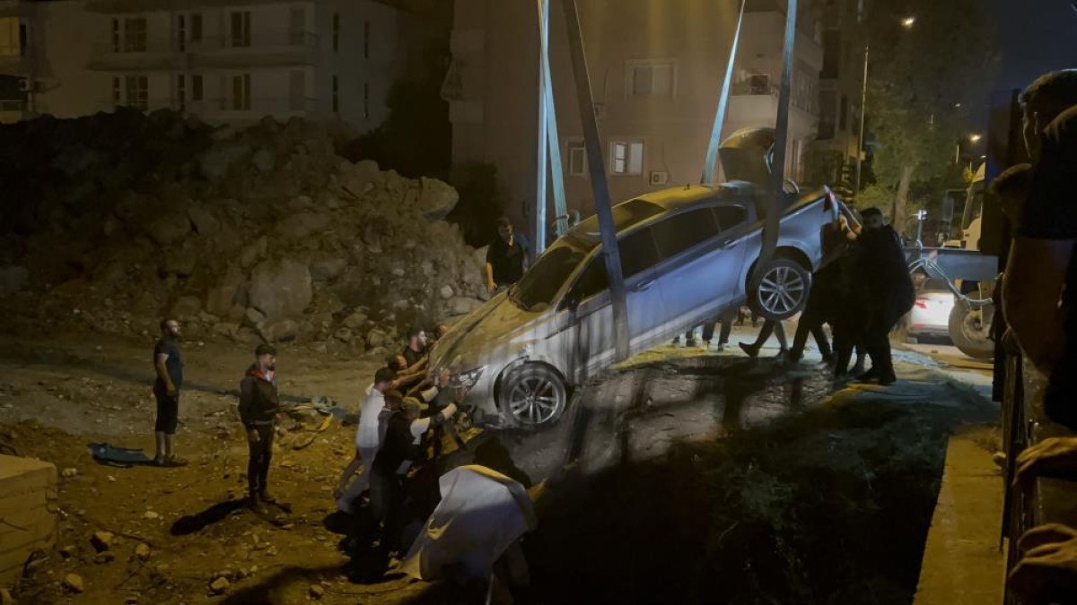 Sürücüsünün navigasyon yardımıyla Arsuz ilçesine gitmek istediği araba, Pirireis Mahallesi’nde sarsıntıda hasar alan ve yıkımı yapılan bina yerine uçtu.