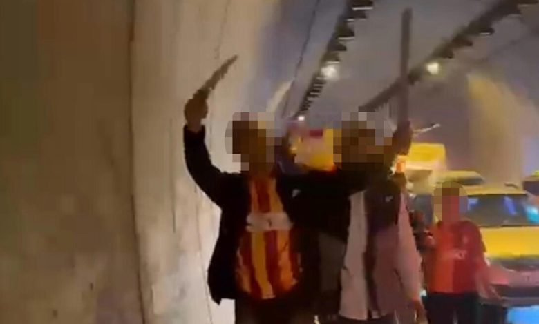 Kutlamalarda yalnızca araç geçişine açık olan Konak Tüneli’nde ellerinde döner bıçaklarıyla yürüyen 2 taraftar dikkat çekti.