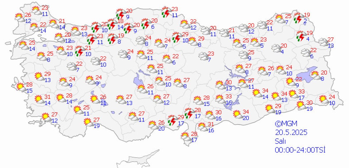 Ülkemizin kuzey ve iç kısımlarının modüllü, yer yer çok bulutlu, Batı Karadeniz, Bilecik, Sakarya, Adana, Osmaniye, Amasya, Kars ve Ardahan etrafları ile Orta ve Doğu Karadeniz kıyı vilayetlerinin iç bölümlerinin sağanak ve gök gürültülü sağanak yağışlı, öbür yerlerin az bulutlu ve açık geçeceği varsayım ediliyor.