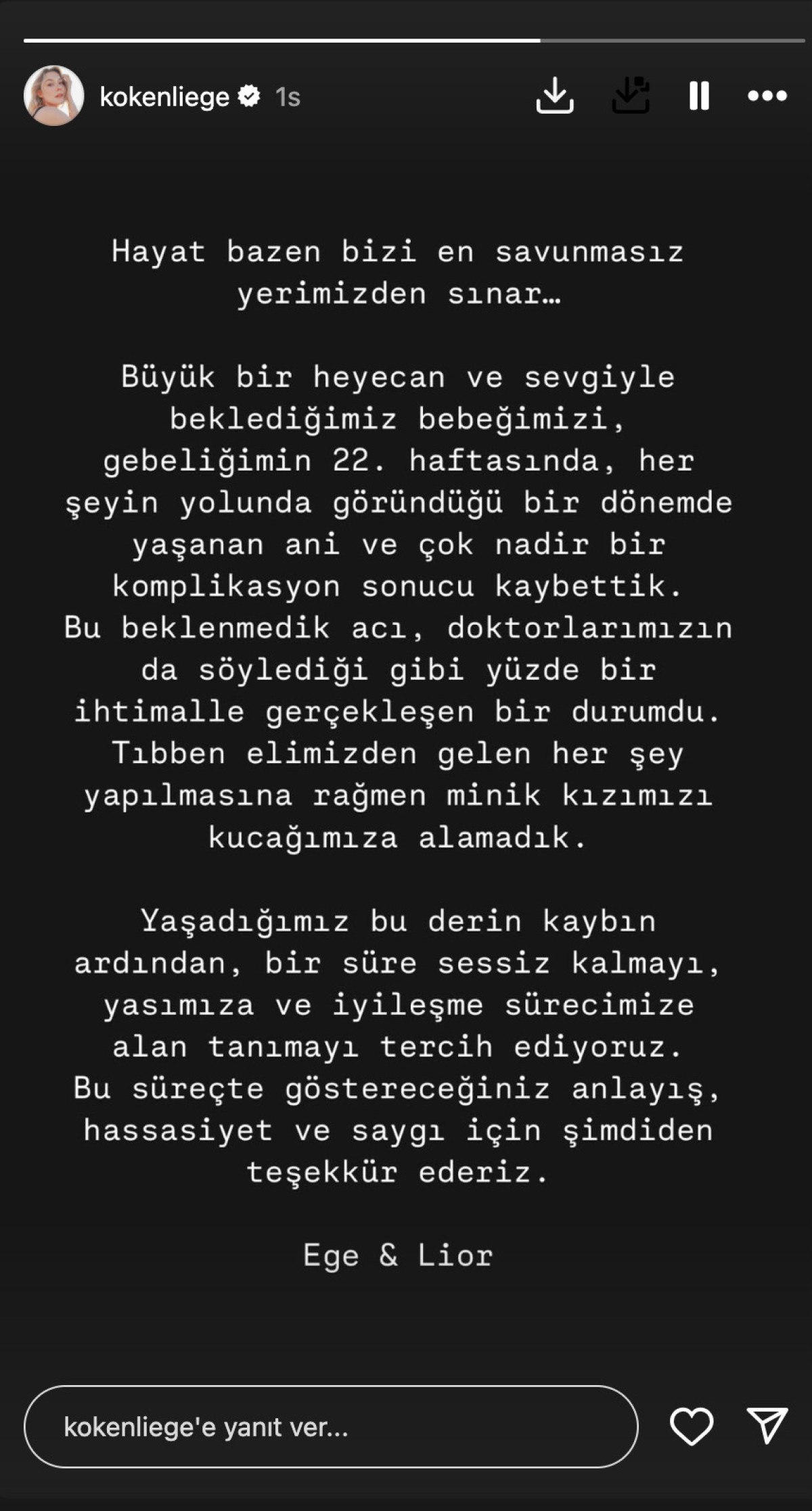 “Hayat bazen bizi en savunmasız yerimizden sınar… Büyük bir heyecan ve sevgiyle beklediğimiz bebeğimizi, gebeliğimin 22.haftasında her şeyin yolunda göründüğü bir periyotta yaşanan ani ve çok az bir komplikasyon sonucu kaybettik.