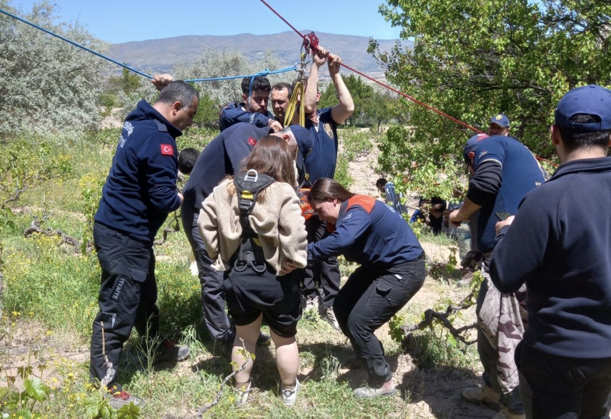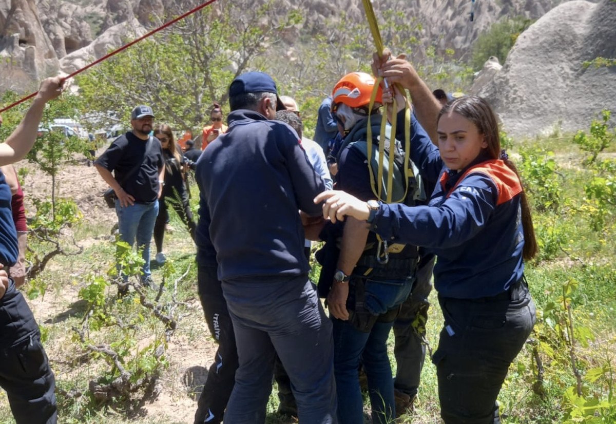 Balondaki 20 turist, yaklaşık 50 metre yükseklikteki kayalıklara indirildi.