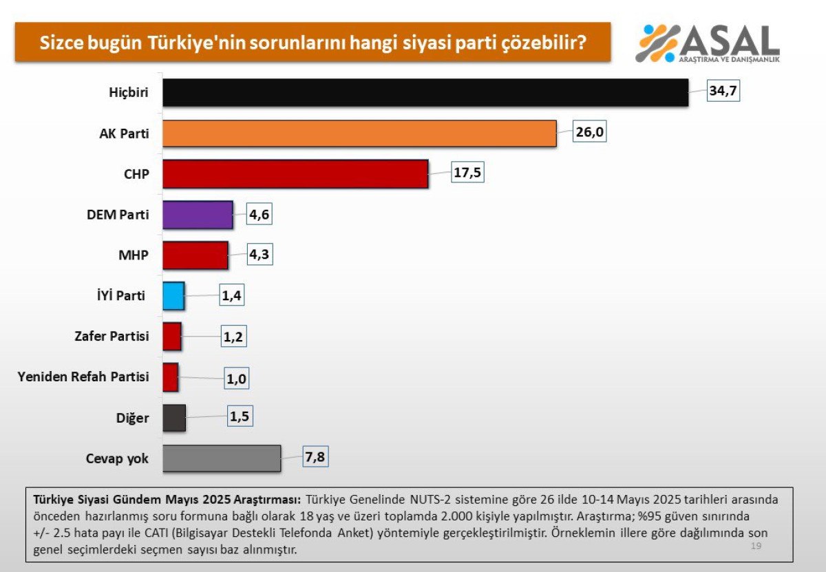 Bu kapsamda Asal Araştırma, “Türkiye’nin sorunlarını hangi siyasi parti çözebilir?” sorusunu halka yönelttiği çalışmasını yayınladı.