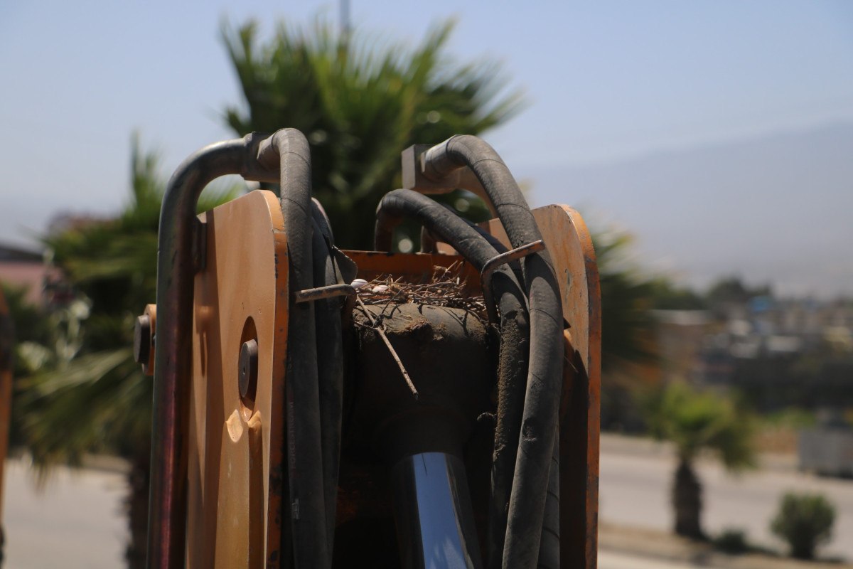 Hatay’ın Antakya ilçesinde hafriyatçılık yaparak ekmek parasını kazanan Bülent Kuyucu’nun Narlıca Mahallesi’nde park halinde bulunan kepçesinin bomunun üzerine kumru yuva yaptı.