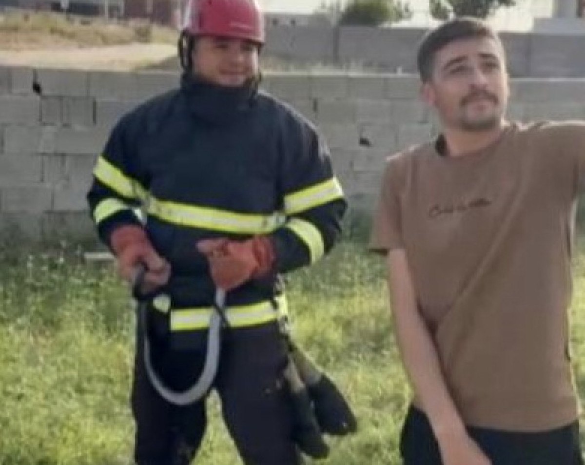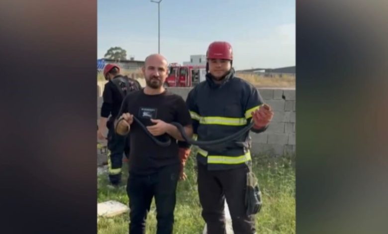 Bahçeye giren bir buçuk metrelik kara yılanı yakalayan itfaiyeci, yılana su içirirken, vatandaşların yılanla hatıra fotoğrafı çektirdiği anlar kameralara yansıdı.