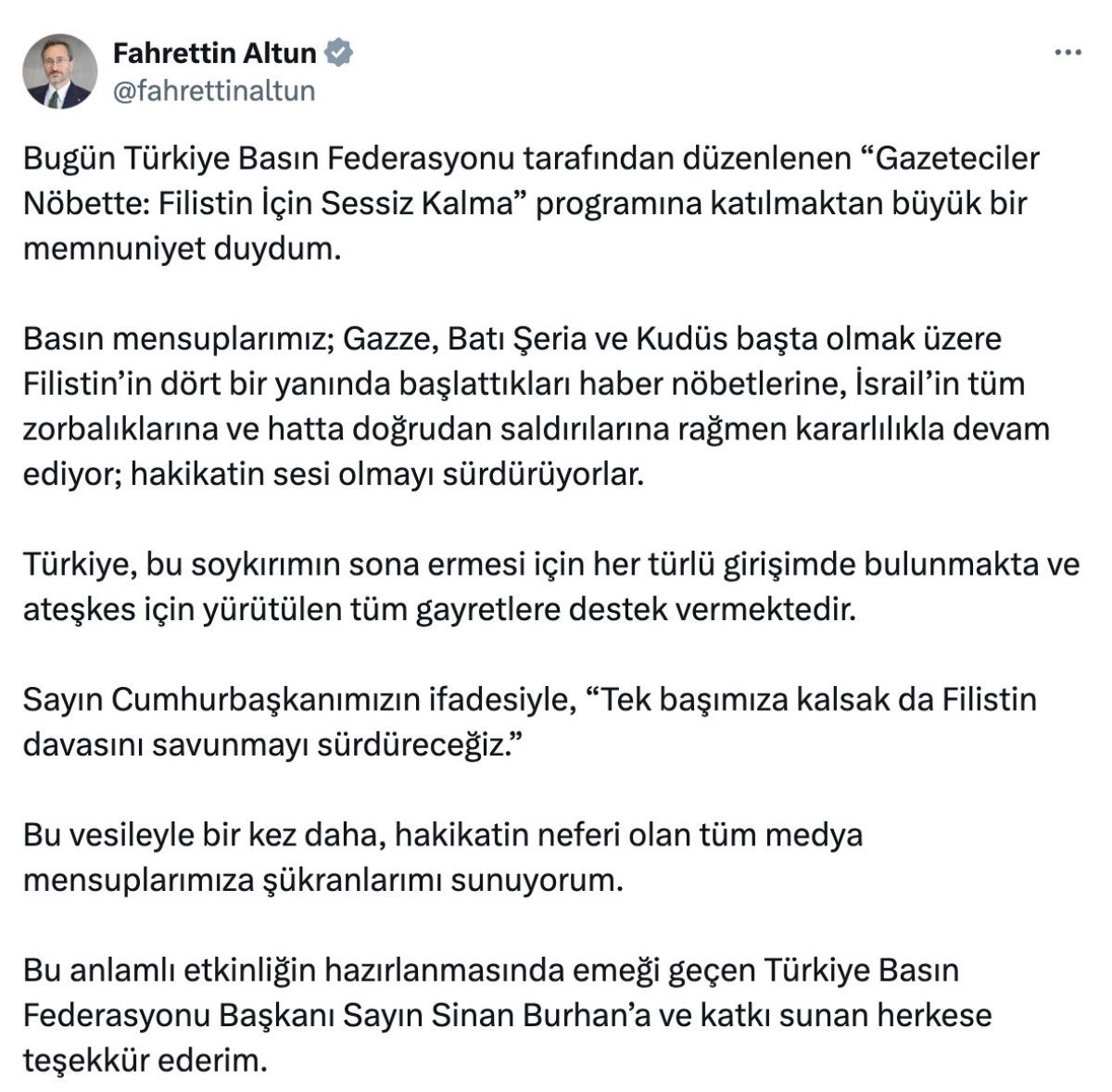Sosyal medya hesabı X’ten paylaşım yapan Altun, “Bugün Türkiye Basın Federasyonu tarafından düzenlenen ‘Gazeteciler Nöbette: Filistin İçin Sessiz Kalma’ programına katılmaktan büyük bir memnuniyet duydum.” ifadesini kullandı.