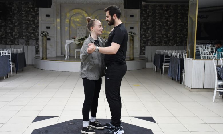 Çift, düğün öncesi nizamlı olarak dans provası yaparak Zeybek figürlerini öğreniyor.