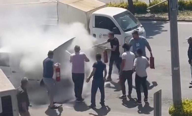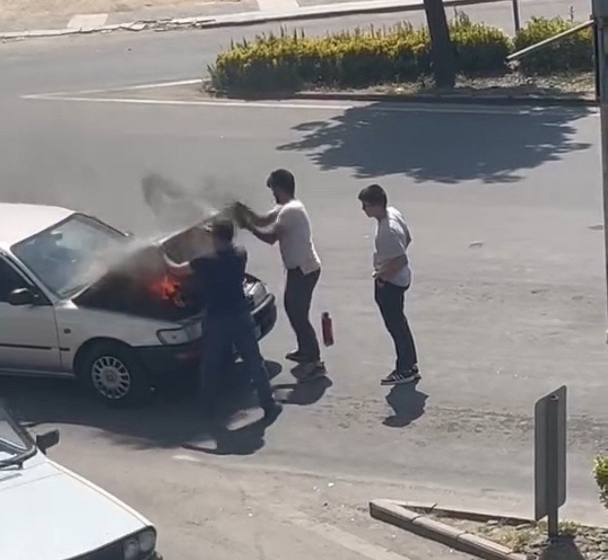 O sırada etrafta bulunan vatandaşlar yangın tüpleriyle alevlere müdahale etti.