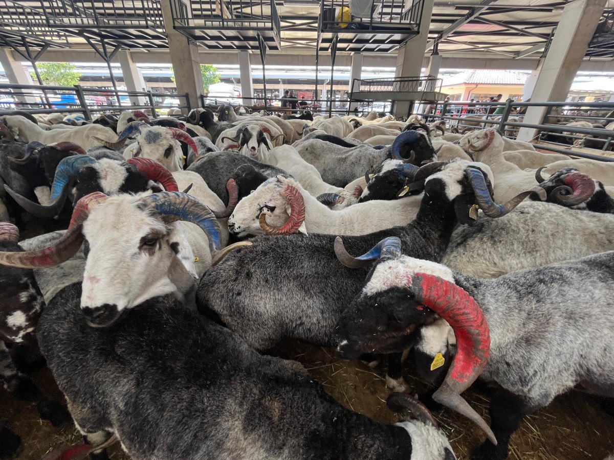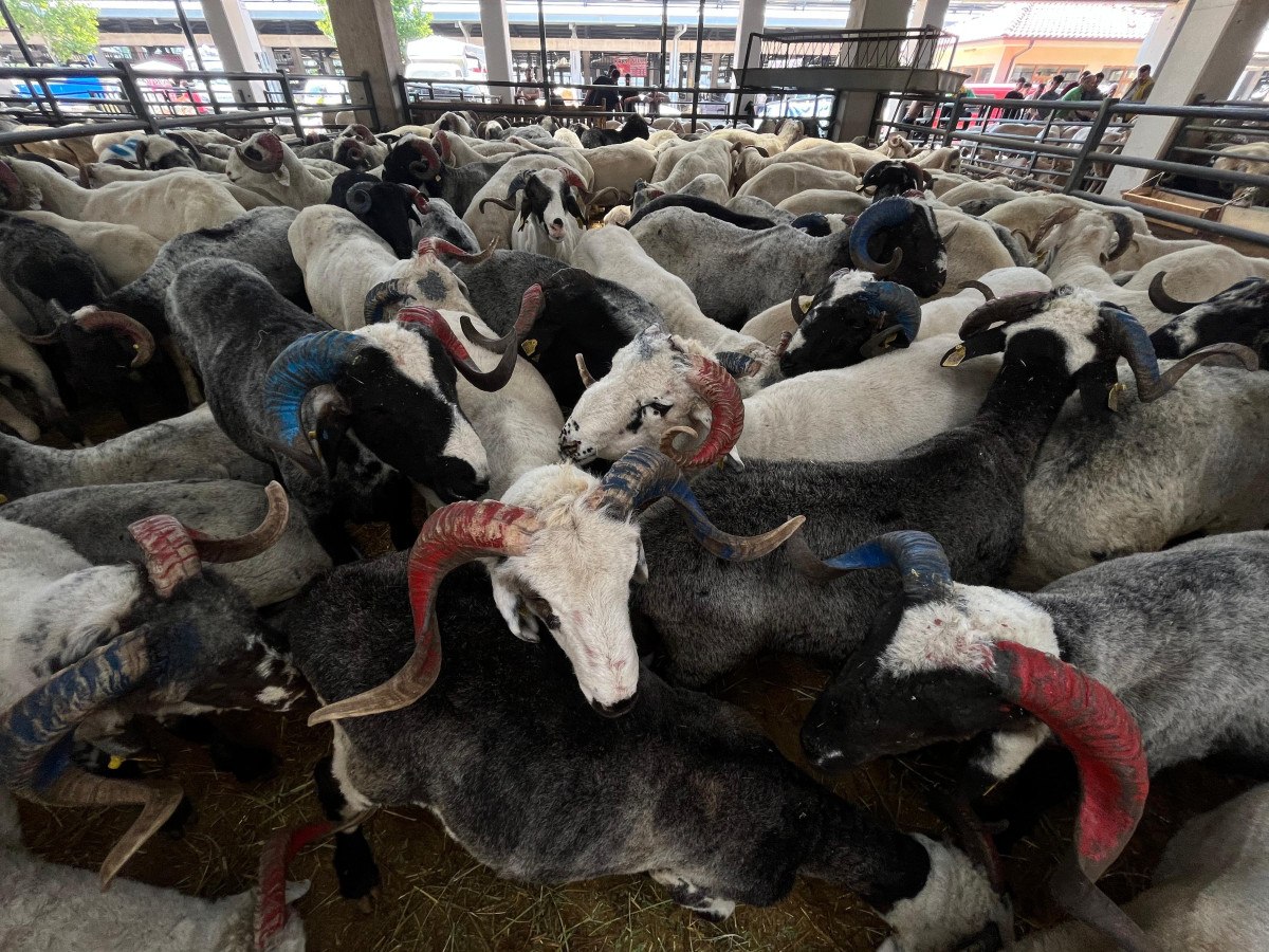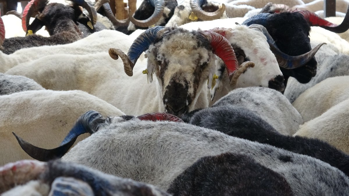 Hayvan pazarına renk katan bordo-mavi boynuzlu koçları görenler, şaşkınlıklarını gizleyemedi.
