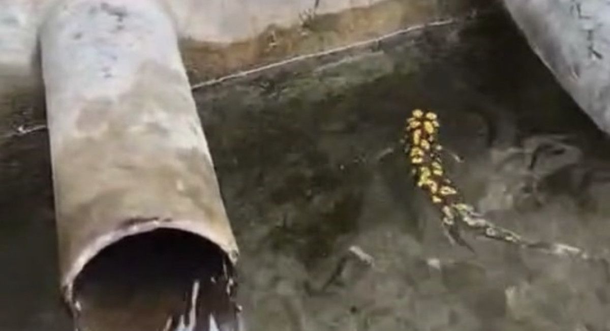 Ardından cep telefonunu çıkaran şahıs, olukta yüzen semenderi uzun mühlet görüntüledi.