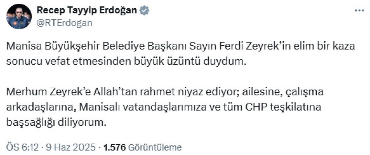Manisa Büyükşehir Belediye Lideri Sayın Ferdi Zeyrek’in elim bir kaza sonucu vefat etmesinden büyük keder duydum.