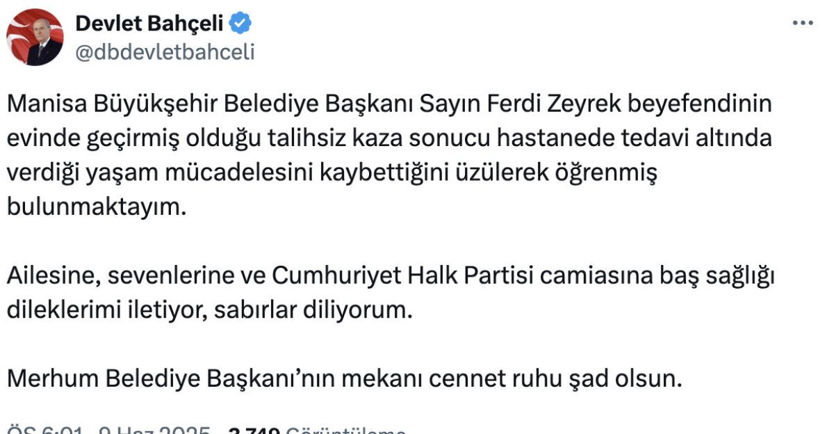 Ferdi Zeyrek’in kaybı sonrası Ömer Çelik’in ardından MHP Genel Başkanı Devlet Bahçeli’den de bir ileti geldi.