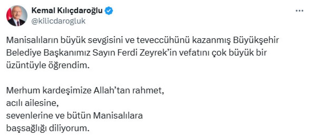 Zeyrek’in vefatı sonrası bir taziye iletisi da CHP’nin eski Genel Başkanı Kemal Kılıçdaroğlu’ndan geldi.