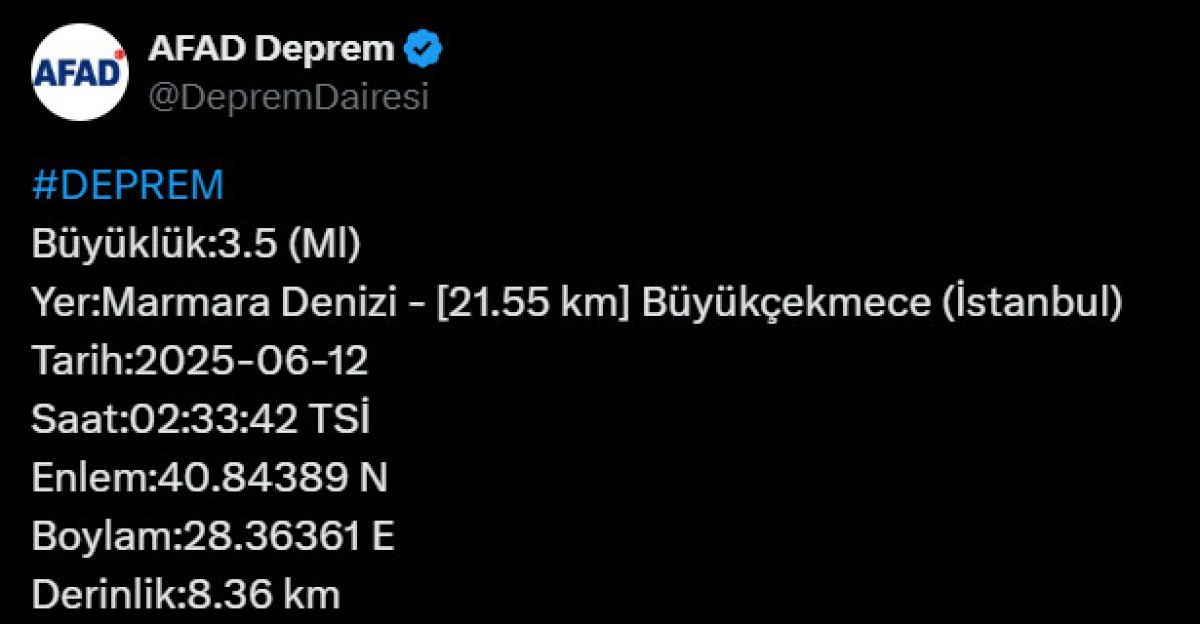 Afet ve Acil Durum İdaresi Başkanlığı’nın internet sitesinde yer alan bilgiye nazaran saat 02.33’te merkez üssü Marmara Denizi olan 3.5 büyüklüğünde sarsıntı kaydedildi.