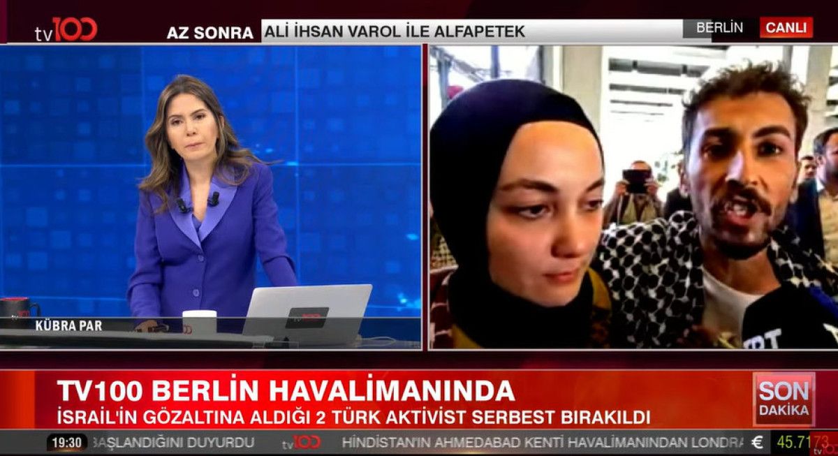 İsrail tarafından özgür bırakılan iki Türk aktivist Şuayb Ordu ve Yasemin Acar, Tel Aviv’den ayrıldıktan sonra Almanya’nın başşehri Berlin’e ulaştı.