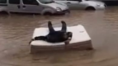 Ortahisar ilçesinde şiddetli yağış sonrası oluşan su birikintisinde bulduğu yatağı suya bırakan bir vatandaş, göle dönen caddede yatak üzerinde seyahat…
