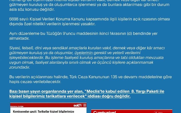 Düzenlemede mevzuatın Avrupa Birliği Genel Veri Koruma Tüzüğüne (GDPR) uyumlaştırılması amacıyla yapıldığına dikkati çekerek, tarikatlara veri aktarılmasıyla hiçbir ilgisi bulunmadığı kaydedildi. Açıklamada, “Herhangi bir kişinin özel nitelikli kişisel verisinin vakıf, dernek veya diğer kâr amacı gütmeyen kuruluş ya da oluşumlarca işlenmesi ya da bunlara aktarılması gibi bir durum asla söz konusu değildir. 6698 sayılı Kişisel Verileri Koruma Kanunu kapsamında ilgili kişilerin açık rızasının olması dışında özel nitelikli verilerin işlenmesi yasaktır. Aynı düzenleme bu Tüzüğün 9’uncu maddesinin ikinci fıkrasının (d) bendinde yer almaktadır” ifadeleri yer aldı.