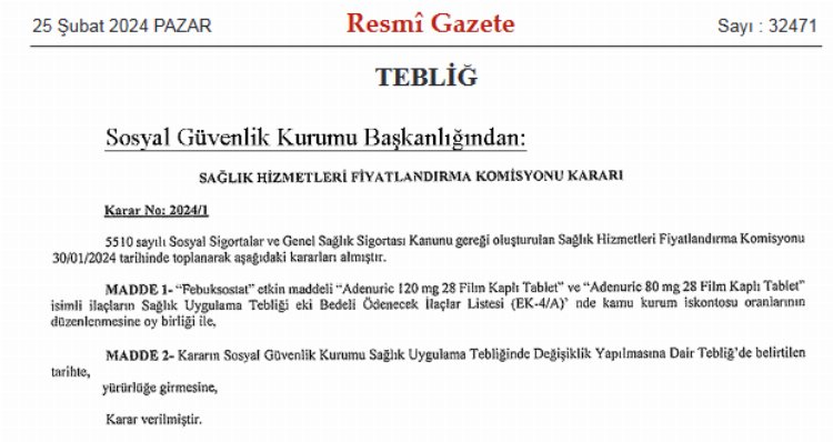 Sosyal Güvenlik Kurumu Sağlık Uygulama Tebliğinde Değişiklik Yapılmasına Dair Tebliğ” ile “Sağlık Hizmetleri Fiyatlandırma Komisyonu Kararı bugünkü Resmi Gazete’de yayımlandı.