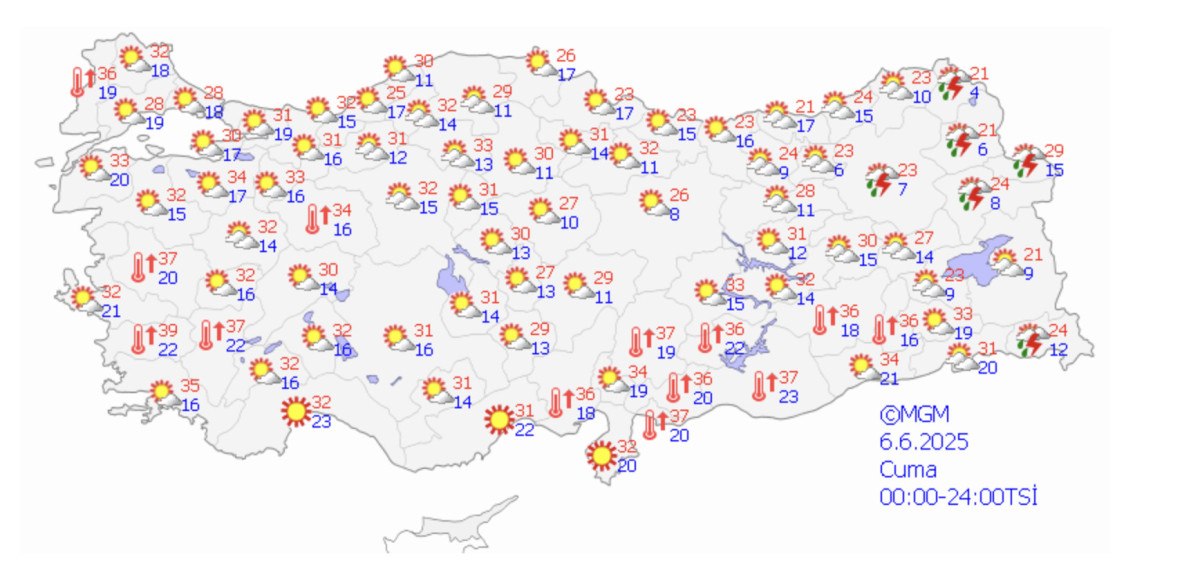 İstanbul: Ekseriyetle kesimli ve az bulutlu. Sıcaklık bugün 31, yarın 30, cumartesi ve pazar 28, pazartesi 29 derece civarında seyredecek.