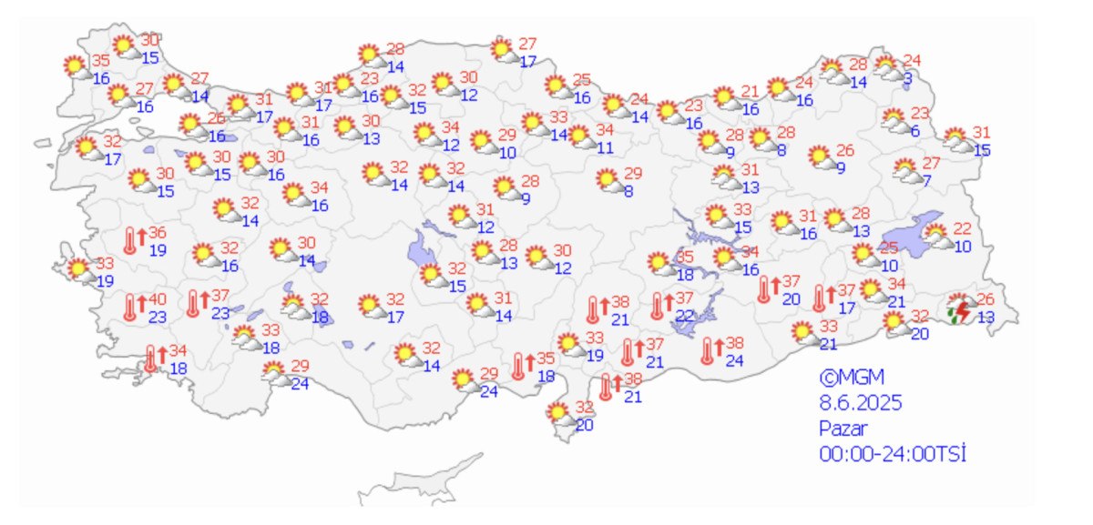 Güneydoğu Anadolu’da gündüz sıcaklıkları 40 dereceye kadar yükseliyor. Marmara, Ege, İç Anadolu ve Güneydoğu Anadolu bölgelerinde ise sıcaklıklar 30 ila 35 derece ortasında olacak.