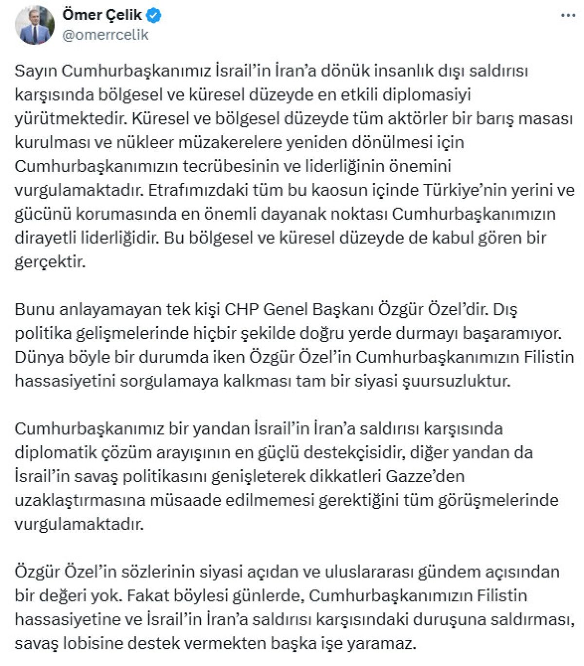 Sayın Cumhurbaşkanımız İsrail’in İran’a dönük insanlık dışı saldırısı karşısında bölgesel ve global seviyede en tesirli diplomasiyi yürütmektedir. Global ve bölgesel seviyede tüm aktörler bir barış masası kurulması ve nükleer müzakerelere yine dönülmesi için Cumhurbaşkanımızın deneyiminin ve liderliğinin değerini vurgulamaktadır.