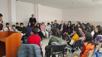 Okulun Çok Amaçlı Salonu’nda, Şerife Olgaç ve Sermiyan Aydın isimli öğrencilerinin moderatörlüğünde yapılan “Çocuklar İçin Tiyatro” konulu söyleşiye öğrenci, öğretmen…